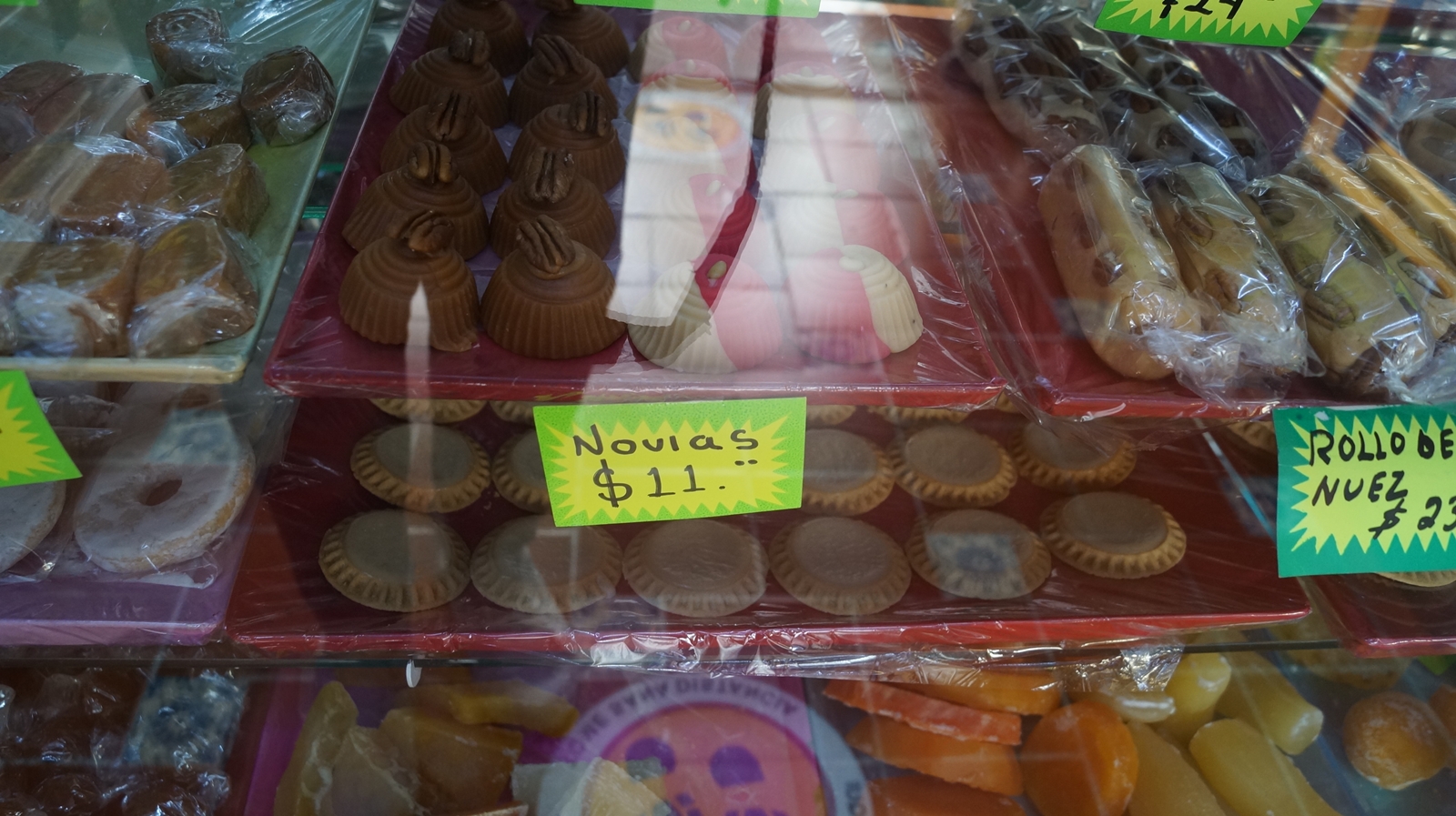 Los camotes, las tortas de Santa Clara, los borrachitos, muéganos, las novias, dulces de leche con nuez y otros dulces típicos mexicanos como palanquetas son vendidas por Antonio Ramos Torres, cuyo negocio se encuentra en el Centro Histórico desde hace tres generaciones.