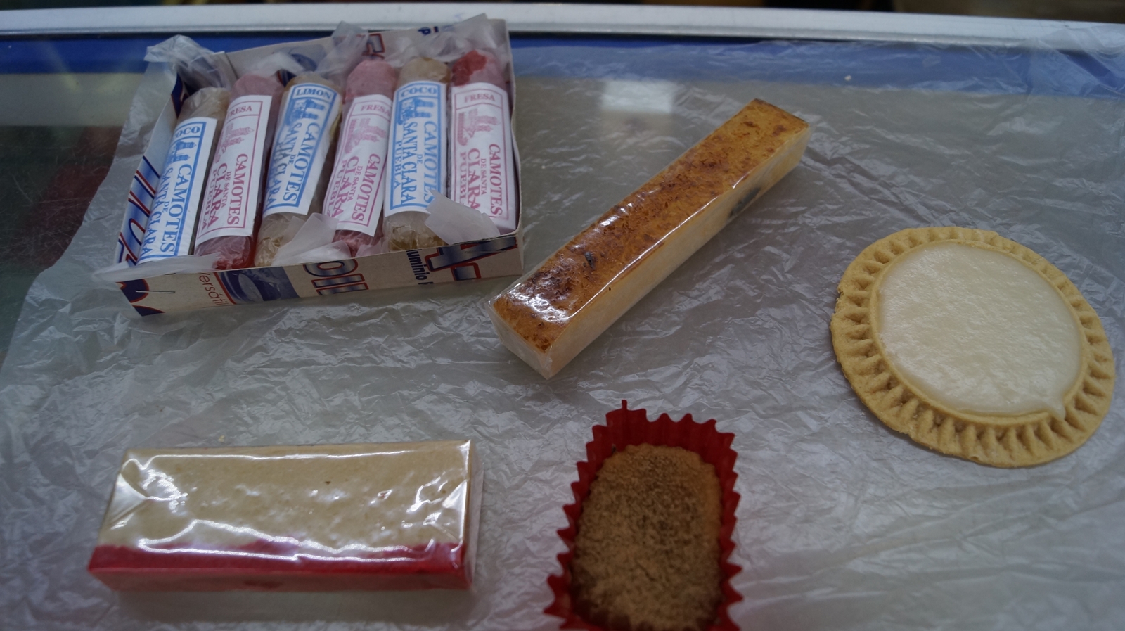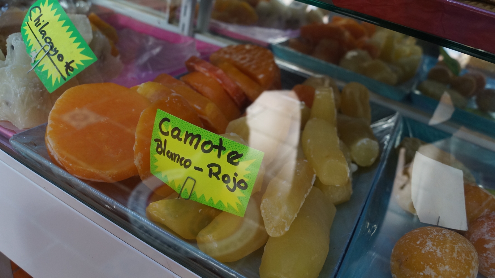 En los cruceros, las pequeñas cajas ofrecen sabores distintos de camotes, un tubérculo que para lograr transformarlo en dulce se necesitan ingredientes como azúcar, agua, esencia de naranja o limón y colorantes vegetales.