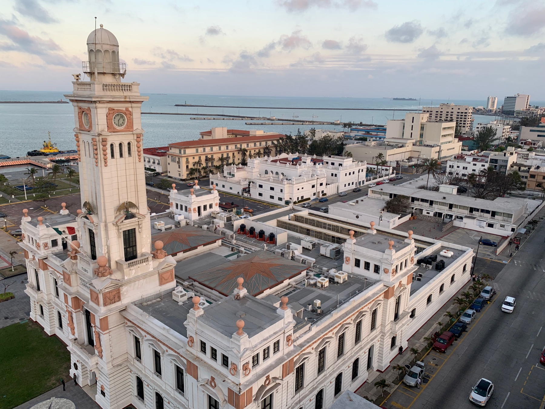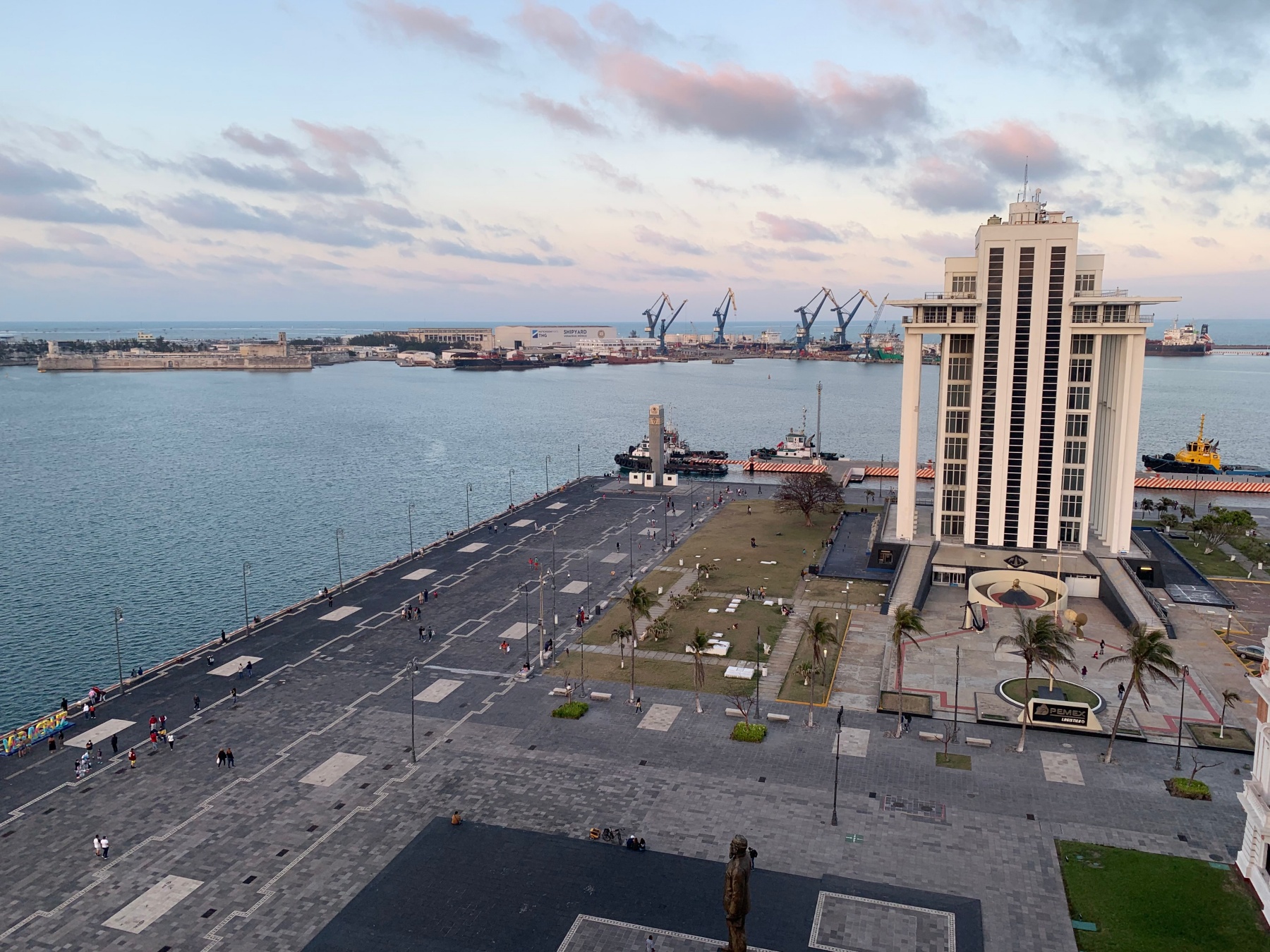 Las formas de las palmeras que rodean el antiguo edificio del Banco de México, las estatuas y monumentos para recordar caudillos o momentos históricos de Veracruz distribuidos a lo largo del paseo del malecón, un edificio blanco que resguarda el Faro de Venustiano Carranza, los jardines en donde se pueden tocar los viejos cañones de guerra y ametralladoras son las formas que dan contraste al paseo del malecón.