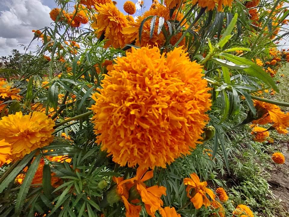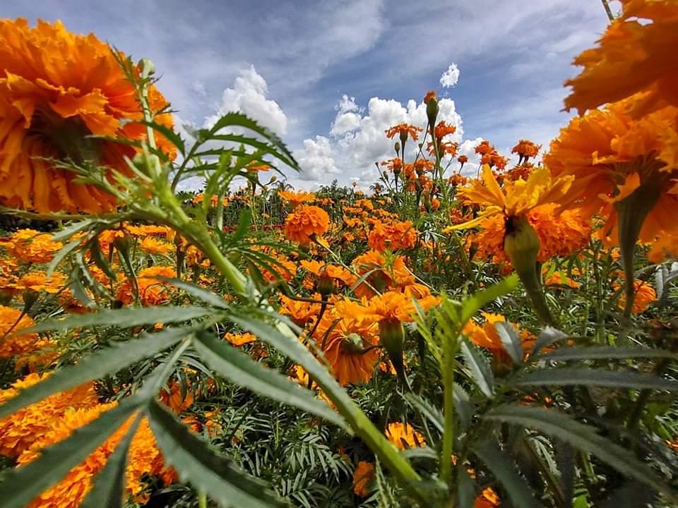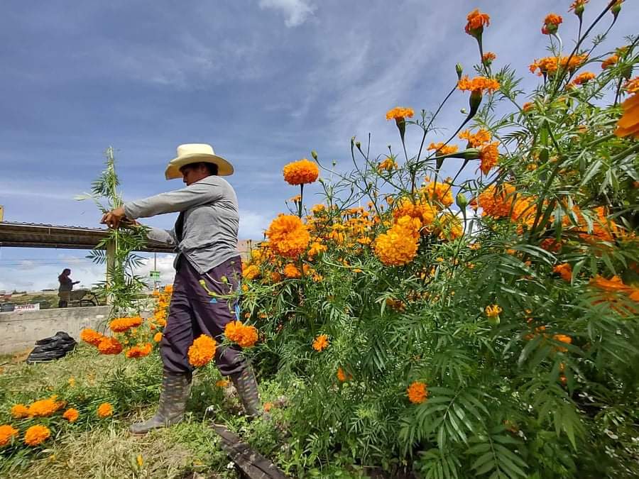 Puebla, Pue.- En el Pueblo Mágico de Atlixco monumentales Catrinas y en grandes extensiones de cultivos de las Cholulas, miles de flores de Cempasúchil para honrar a nuestros muertos.