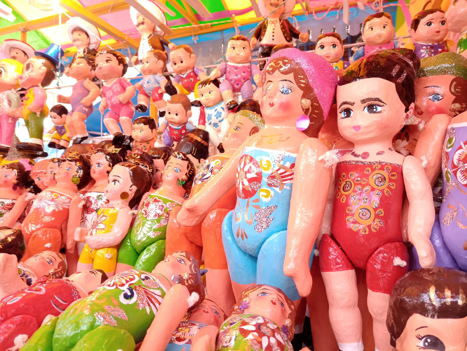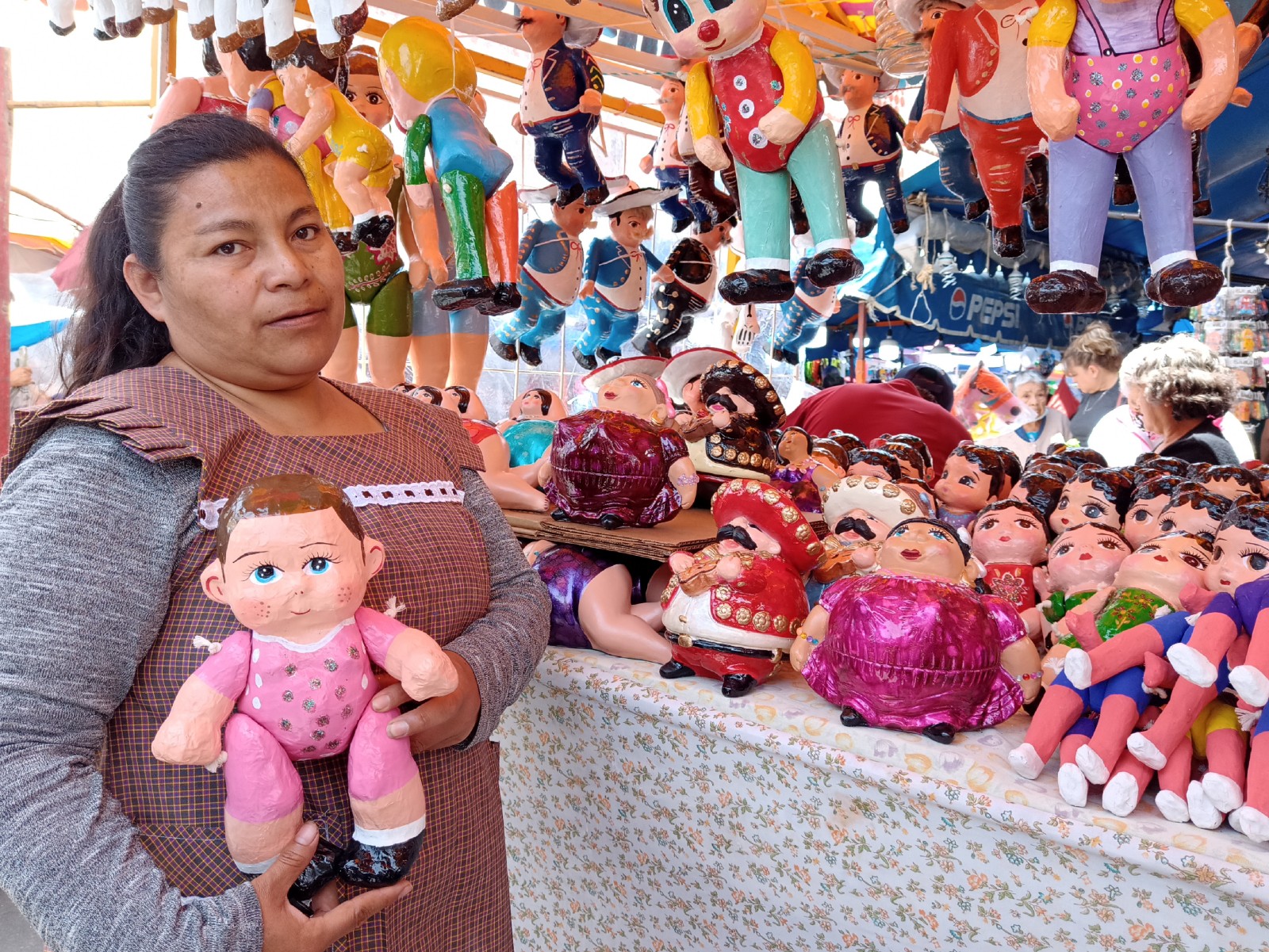 “Nosotros tenemos como 20 y 30 años en cartonería, hay gente que las figuras tradicionales las traen de Celaya, pero nosotros fabricamos nuevos modelos, fabricamos payasos y chavelos para que sean atractivo para los niños”, cuenta Beatriz, al mostrar una muñeca con la cara redonda, cabello corto, ojos azules y mejillas rosas muy marcadas.