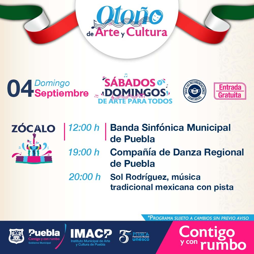 Organizada por el Instituto Municipal de Arte y Cultura de Puebla (IMACP), esta agenda especial, denominada “Otoño de Arte y Cultura”, llenará nuevamente de presentaciones, performance y muchas sorpresas más el Zócalo de la Ciudad, el Parque Jardín San Luis, la calle 5 de Mayo, el Jardín El Carmen, el Teatro de la Ciudad y la Galería de Palacio Municipal.