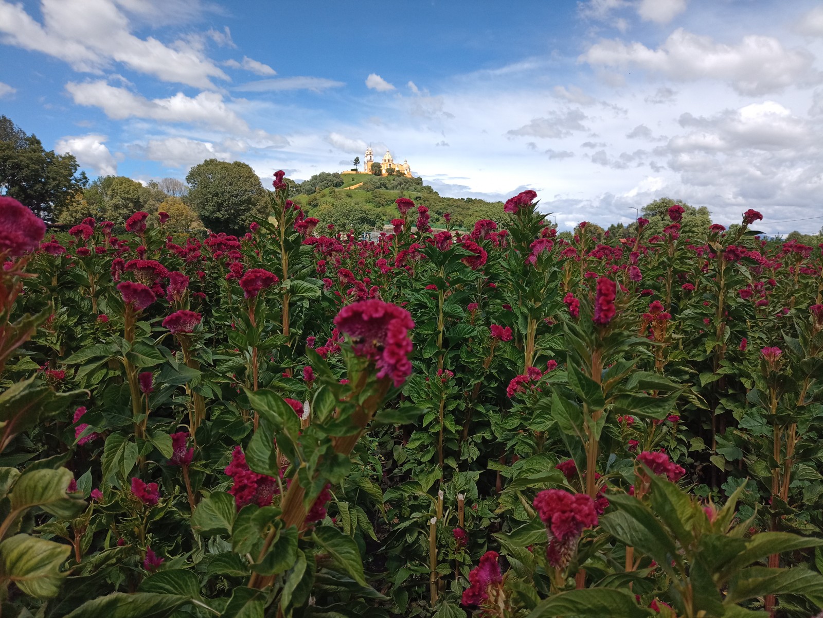 Son los campos de los muertos o de sus flores que llenan los suelos en medio del otoño, con la pirámide de Cholula como fondo, mientras su olor, ese que evoca a las ofrendas, se expande por los alrededores.