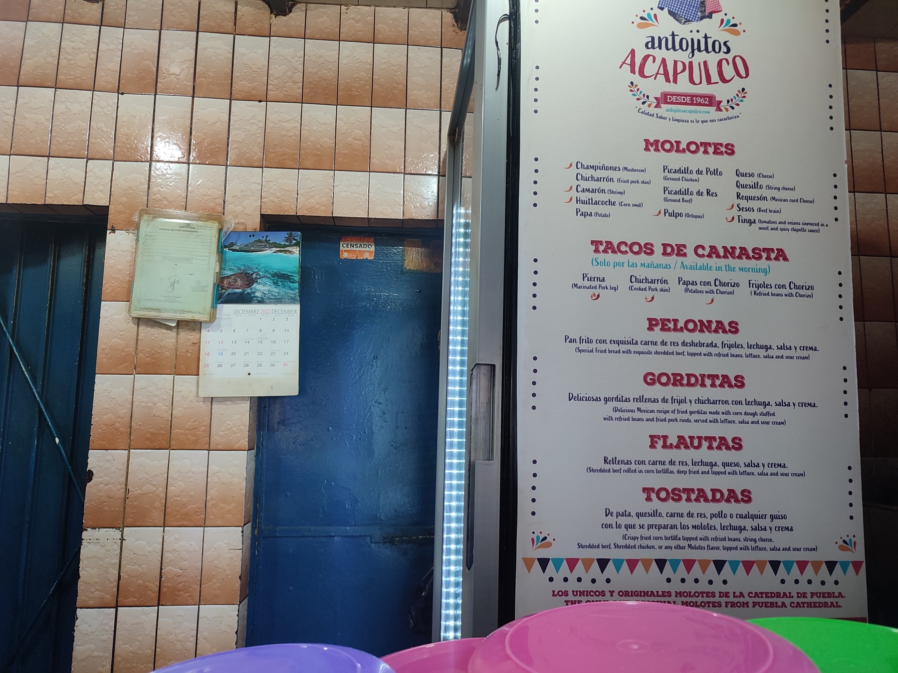 “Los únicos y originales molotes de la catedral de Puebla”, ese es el anuncio que recibe a los comensales en ‘Antojitos Acapulco’ que ofrecen sus platillos desde 1962, convirtiéndose ya en una verdadera tradición para los poblanos y los turistas. De hecho, su menú está descrito en español y en inglés debido al gran interés que despierta sus productos en los visitantes extranjeros.