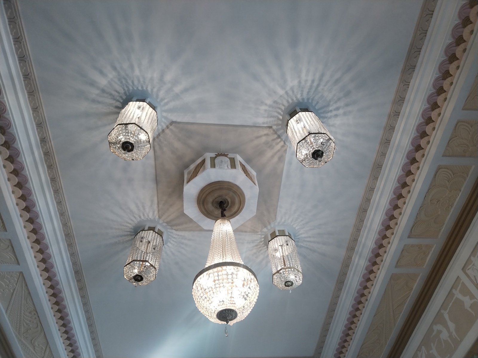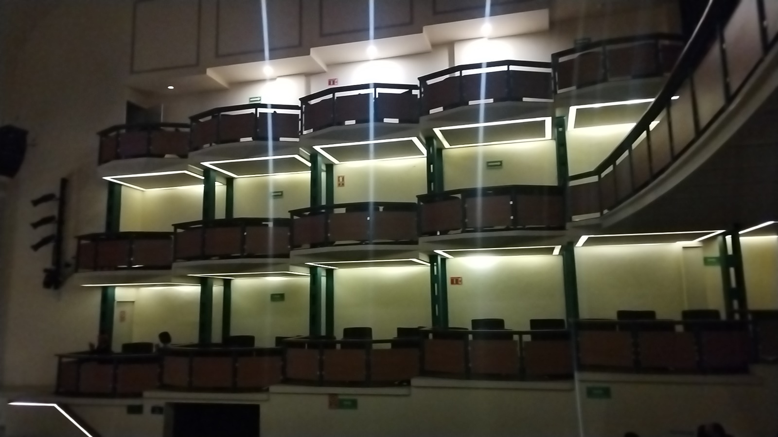En cuanto al vestíbulo, destacan las marquesinas con molduras de yeso en las que hay siluetas de bailarinas ejecutando distintas rutinas. Sacando fotografías de cada una de ellas, podría hacerse un pequeño montaje en movimiento de una danza en miniatura.
