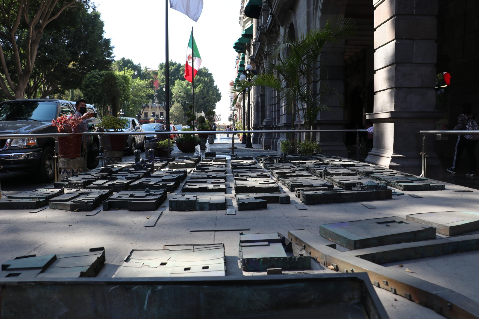 • Retiro y traslado de 63 manzanas, cuatro escudos y tres placas conmemorativas al taller del Maestro Pablo Rafael López Artasánchez.