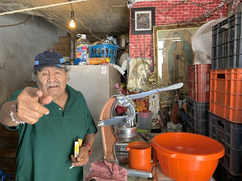 -Éramos 14 hermanos de misma madre y padre. Llegaba la casa hasta alláaa. Todos teníamos un cuartito: 1-2-3-14. Pero llegó el gobierno y para construir, “¡órale, a chingar a su madre!”. A los de Actipan, San Lorenzo, Axotla y Xoco les pusieron su casa en Meyehualco y los volvieron pepenadores. Este pueblo se vació. Como yo no tuve escuela, ahorita vendo jugo de naranja. Pero antes fui pelotero de pelotas de tenis en el club de ricos que estaba donde está el Walmart, barrendero, bolero, voceador del Ovaciones y en septiembre vendía banderitas. Hice de todo, menos antecedentes penales-, aclara.