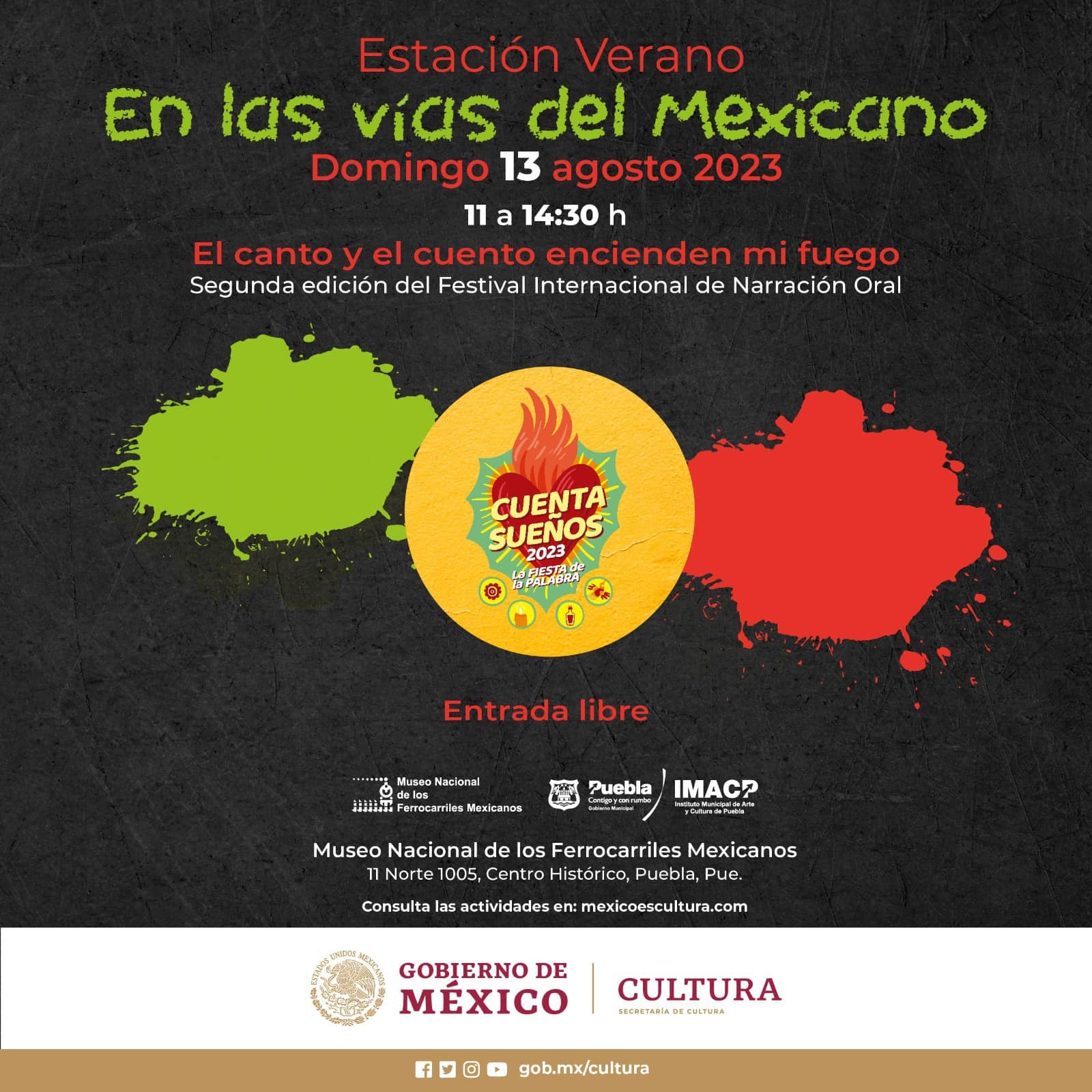 Este fin de semana también estará la exposición “Estación Verano: En las vías del Mexicano”, un trabajo conjunto con la Secretaría de Cultura del Estado, donde las y los más pequeños son los invitados especiales, comenzando el sábado 12 de agosto a las 12:00 horas en el Museo Nacional de los Ferrocarriles Mexicanos, con el circo y diversión de ‘Los Viajeros’ realizada por el Colectivo Escarabajo, para las 13:00 horas escuchar un buen rock a cargo de ‘The Peludos Fur Experience’ y continuar el domingo 13 de agosto con la Segunda edición del Festival Internacional de Narración Oral, con el cuento titulado ‘El canto y el cuento encienden mi fuego’.