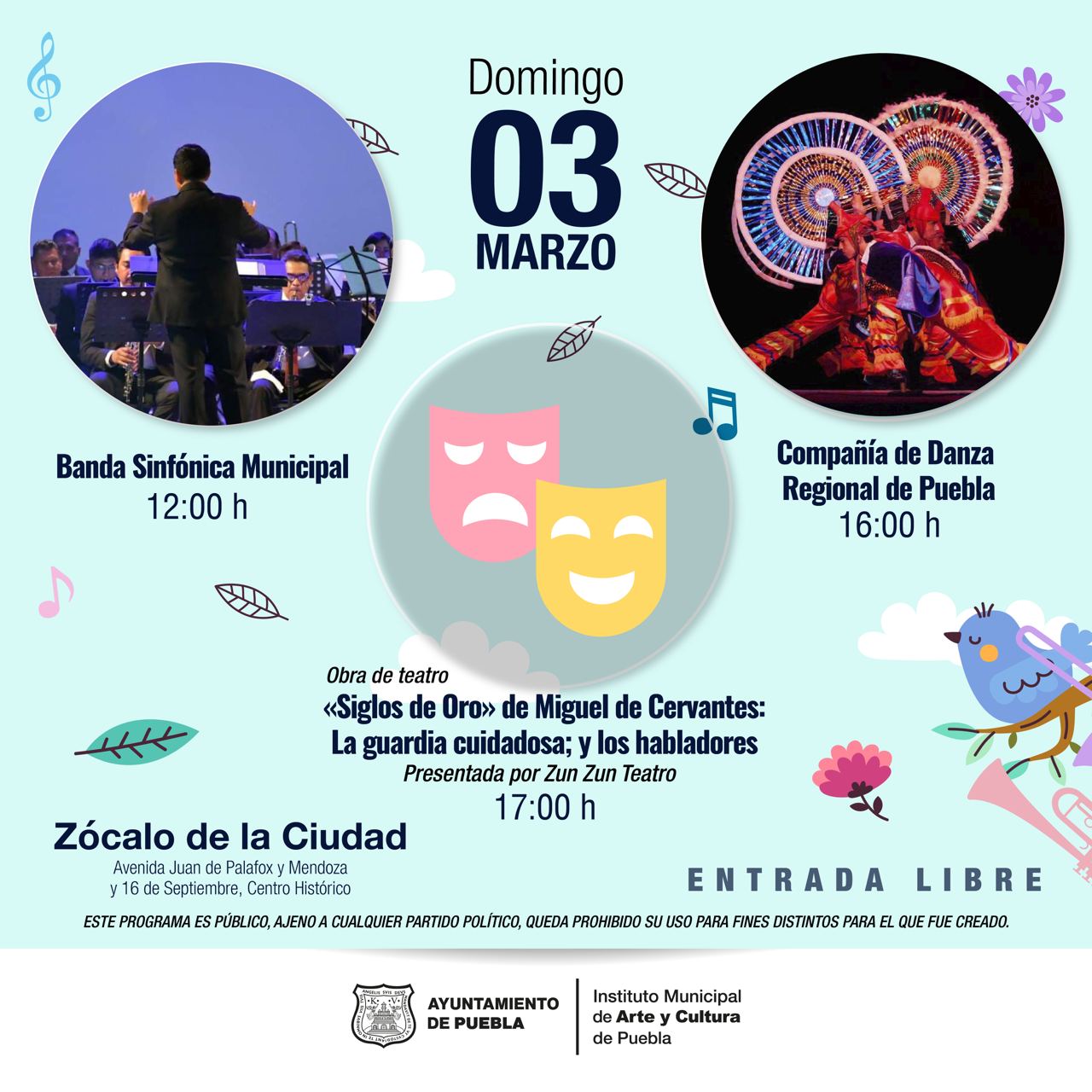 Mientras que el domingo 3 de marzo estarán en este mismo espacio la Banda Sinfónica Municipal a las 12:00 horas, la Compañía de Danza Regional de Puebla a las 16:00 horas y la Obra “Siglos de Oro” de Miguel Cervantes por grupo Zun Zun a las 17:00 horas.