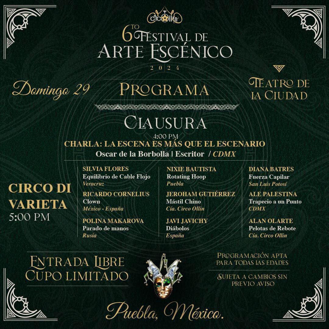 Y el domingo 29, a las 16:00 horas en el Teatro de la Ciudad se realizará la clausura de este festival con la Charla “La Escena es más que el Escenario” impartida por Óscar de la Borbolla; para continuar con Silvia Flores con Equilibrio de Cable Flojo; Ricardo Cornelius con Clown; Polina Makarova con Parado de manos; Nixie Bautista con Rotating Hoop, Jeroham Gutiérrez con Mástil Chino; Javi Javichy con Diábolos; Diana Batres con Fuerza Capilar; Ale Palestina con Trapecio a un Punto y Alan M. Olarte con Pelotas de Rebote.