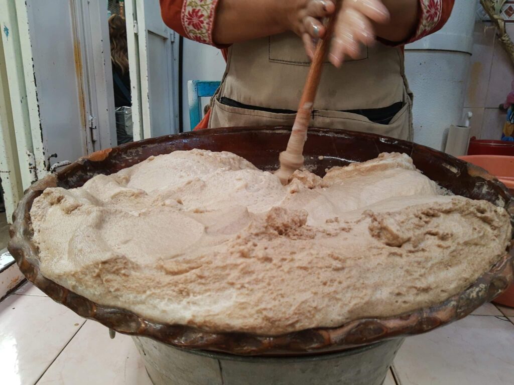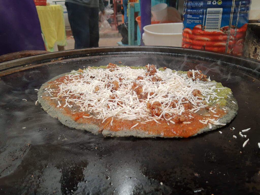 *En el mercado “Cosme del Razo” en San Pedro Cholula se prepara un manjar hecho a base de maíz azul,...