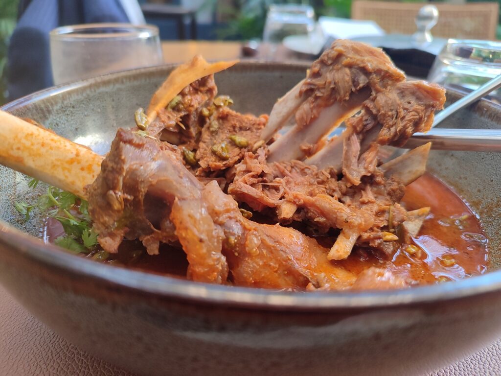 *Servido en platos muy hondos, con el caldo rojizo muy caliente y los huesos sobresaliendo con la carne muy pegada,...